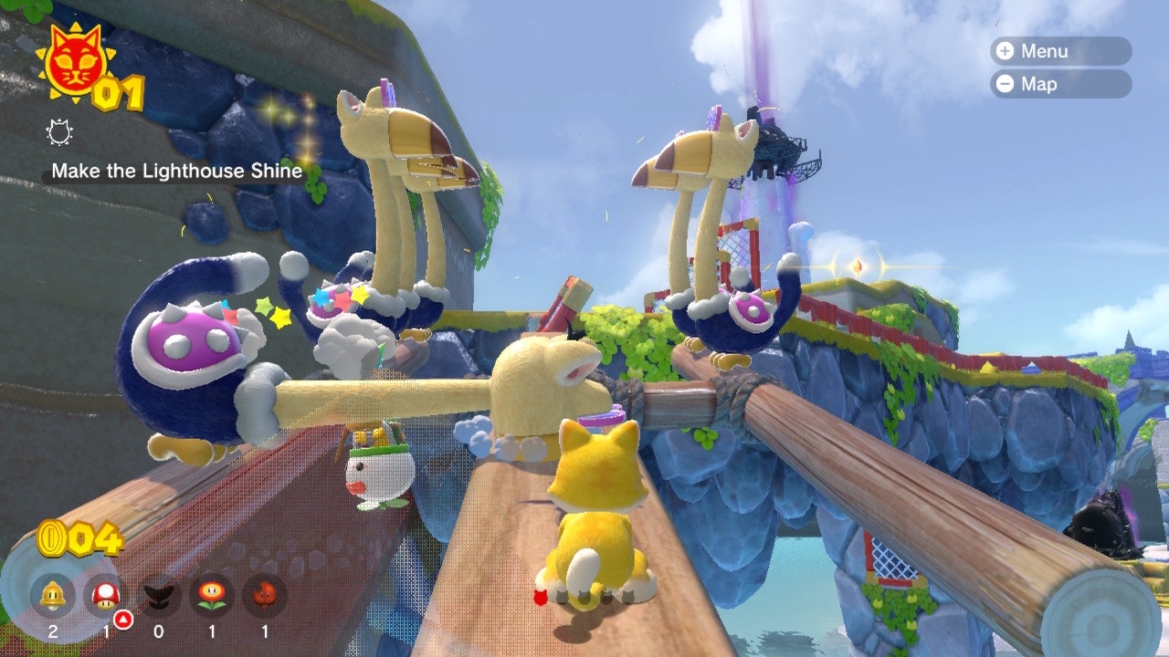 Every so often Bowser will rise and make your life miserable. Suddenly you are on the defense and survival is your number one goal. While Bowser is being a menace, collecting Cat Shrines will return him to a static state until he is free to come after you again. You’ll know he is about to rise when the weather starts to change. By the time he appears you will also be dealing with a tropical storm. Collecting Cat Shrines is a blast. You’ll find them by completing traditional platforming areas, collecting items, catching rabbits, and so many more ways that we won’t spoil for you here. They really take the core elements of a 3D Mario game dating back to the N64 days, add the openness of Mario Odyssey, the level design of Super Mario 3D World, and elements from nearly every game in the cannon in order to give us what may be the best Mario Game to date. The length will obviously keep it from ever winning that crown, but we’d love to see a longer iteration of this in the future. Once you think you’ve finally figured out exactly how to handle this game, they throw one more incredible feature at you. After collecting so many Cat Shrines you will unlock Bell’s around the island that, when opened, will give you the ability to morph into a giant version of Mario and take on Bowser in an epic battle that competes with Godzilla vs. Kong as one of the all-time great monster fights. Every time Bowser hits you with an attack, find the Bell Shrine and you will be restored.