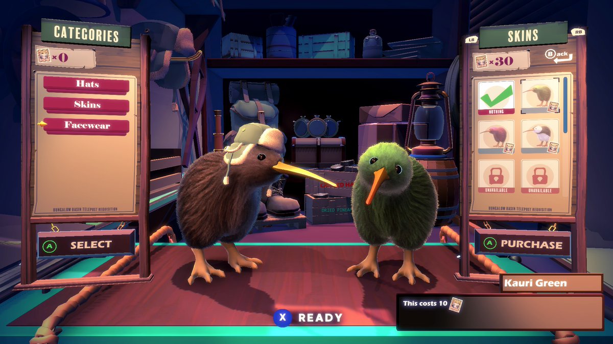 Stamps can also be collected by completing score based challenges in KeyWe’s aforementioned Overtime Shift mode. In Conveyor Belt Chaos, a quickly moving stream of packages need to be appropriately labelled. Each package that is properly labelled awards a set amount of points that contribute to a total. The more points you have when the time runs out means the more stamps you get as a reward. Perhaps our favorite level in the game, however, was Lunch Break. This level saw us satiating the thirst and hunger of a platoon of angry cassowarys who act as Telepost’s delivery employees. Small bubbles appear over the heads of the belligerent birds that show what kind of food they want. Jeff and Debra have to get the appropriate food to their bowl quickly, otherwise the cassowary’s will start squawking in anger. When this happened we had to rapidly tap the left trigger to calm the cassowary’s and prevent mayhem. All of our time in KeyWe was spent in single player mode. Despite the game clearly being made for co-op, solo mode was extremely easy and enjoyable. A hot swap feature allows players to quickly swap between Jeff and Debra making it simple to best utilize both kiwis to complete tasks. You’re even able to control both birds at the same time for specific jobs that require both kiwis. However, in order to beat more advanced levels at a faster pace and unlock the most stamps, coop play is a must. We’re looking forward to grouping up with another player as it’s easy to see how much fun the game is with a friend and how well its mechanics are executed for coop play. Either way, don’t let the cooperative tag detract you if you’re a solo player.